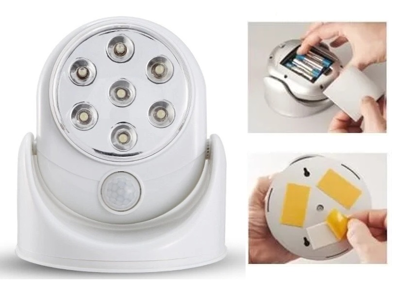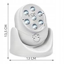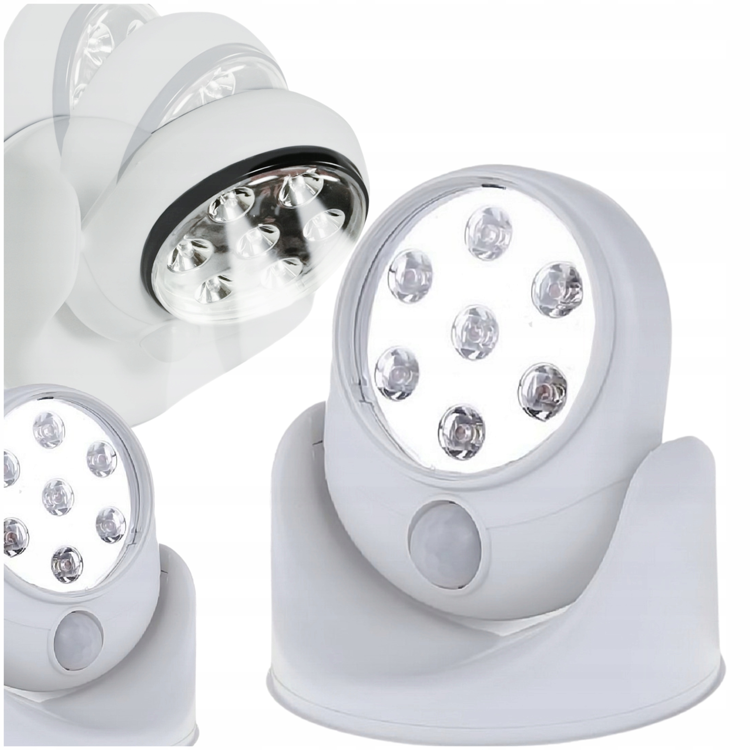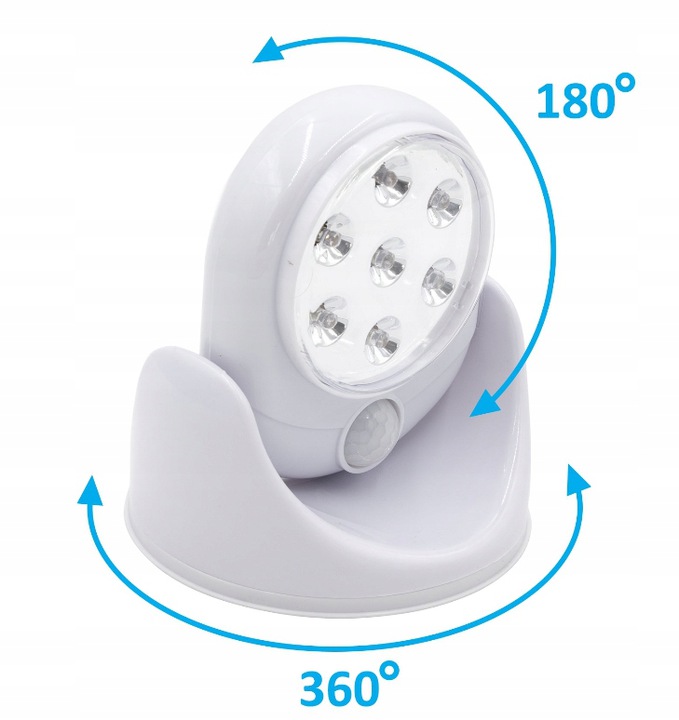 Lampka po wykryciu ruchu zapala się na 30 sekund, po czym gaśnie, chyba że ponownie wykryje ruch. Dzięki 7 diodom LED posiada mocne, białe i energooszczędne światło.  Technologia LED gwarantuje, że baterie działają bardzo długo. Lampka jest idealna do montażu w korytarzach, szafach, komórkach, w kuchni, garażu, lub nad drzwiami wejściowymi, przy furtce... Zapewni domownikom bezpieczeństwo nocą, bez konieczności włączania tradycyjnego oświetlenia. Lampka posiada z tyłu praktyczne otwory do powieszenia jej na kołkach na ścianie. Można ją również przykleić za pomocą dwustronnego przylepca. Dzięki obrotowej podstawie 360 stopni i ruchomej głowicy, można skierować światło dokładnie tam, gdzie jest potrzebne.