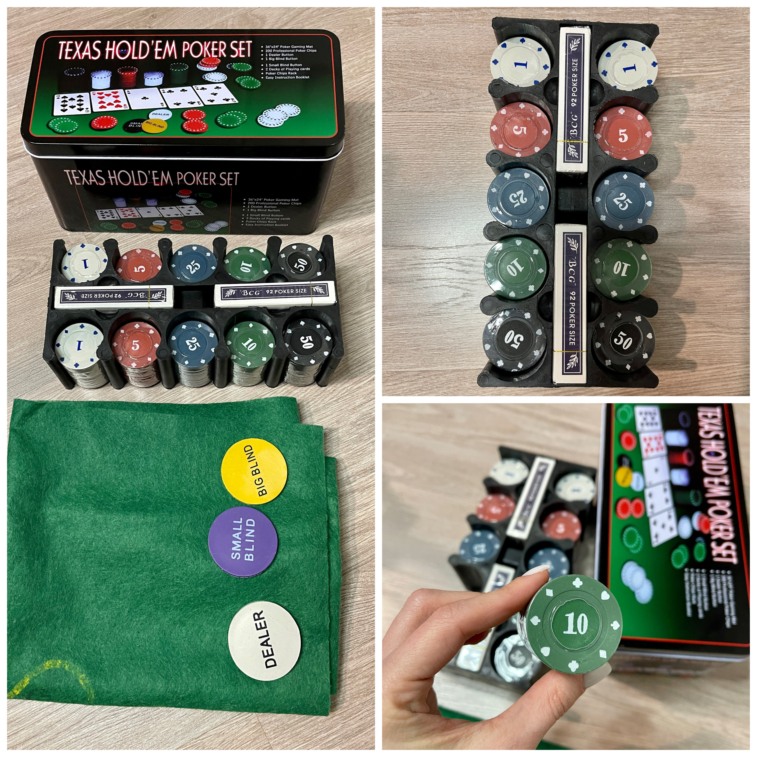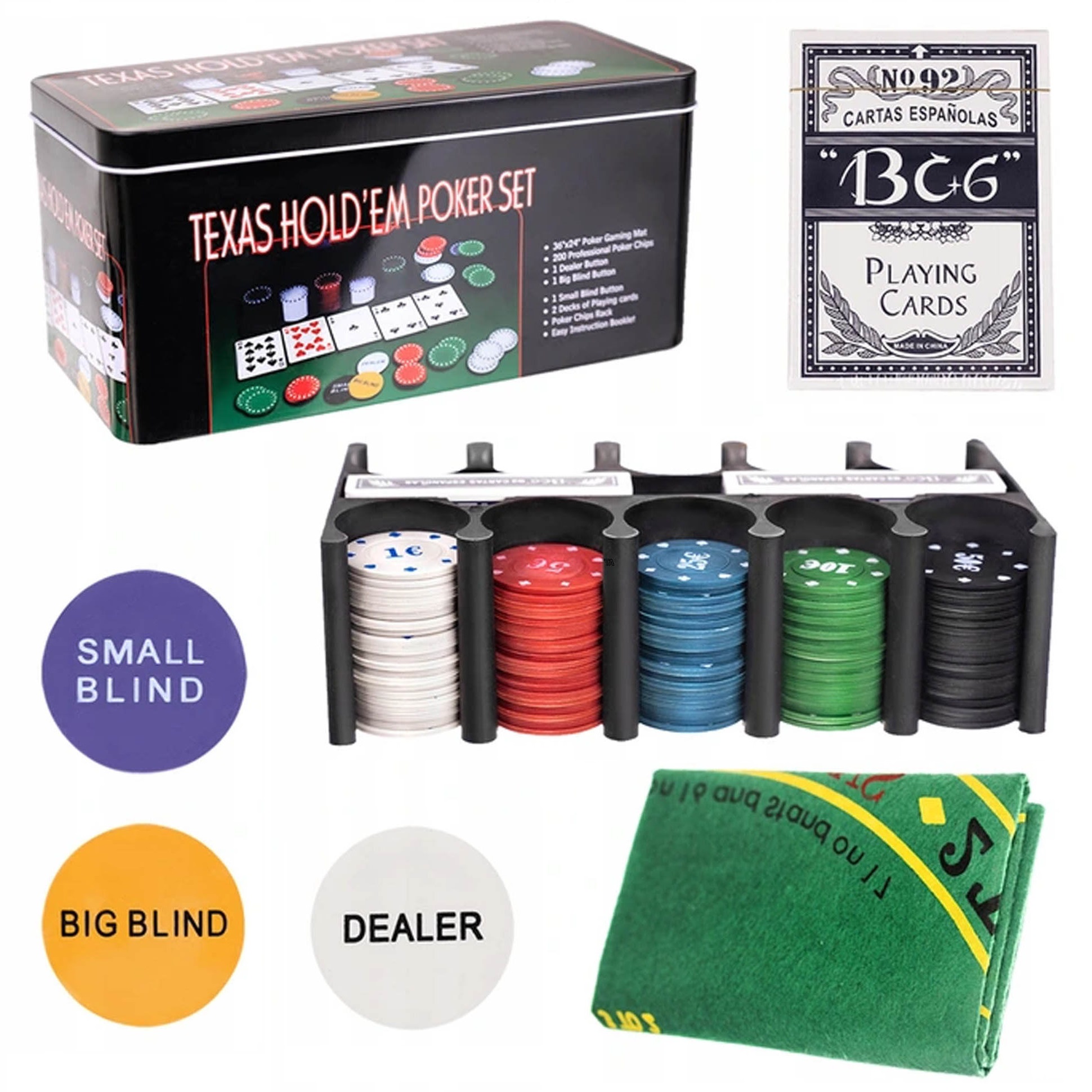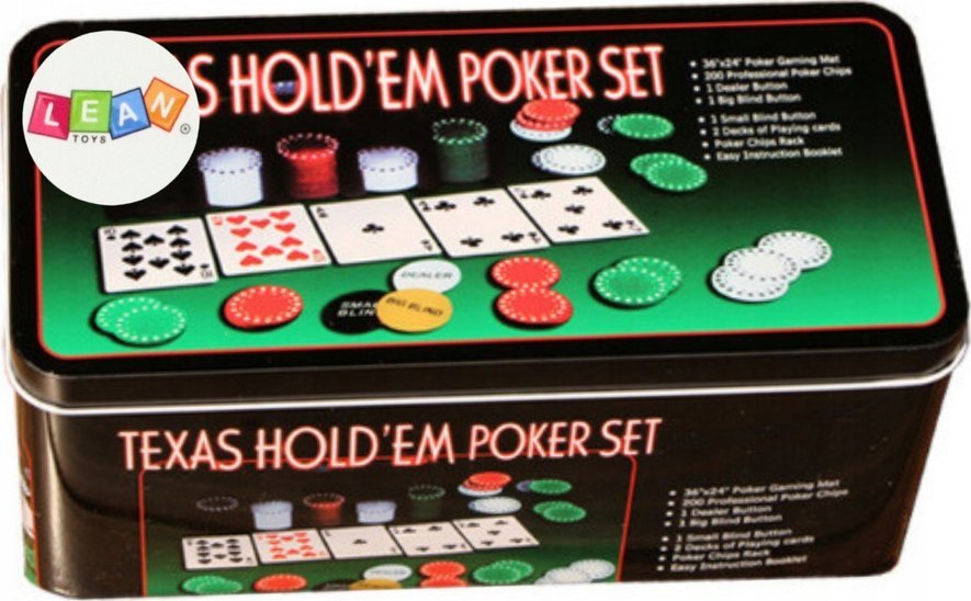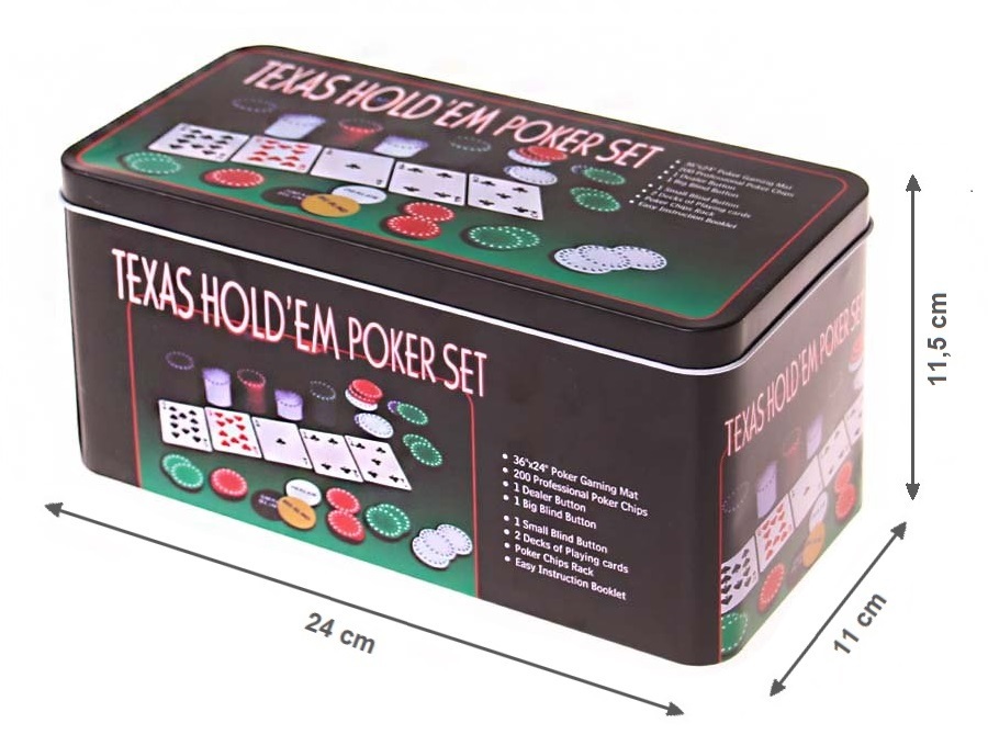 Profesjonalny, solidnie wykonany zestaw do gry Poker Texas i innych gier karcianych. Zestaw zawiera zieloną matę, dwie talie kart, trzy znaczniki krupiera oraz komplet 200 żetonów oznaczonych pięcioma wartościami. Całość jest spakowana w metalowe pudełko, co pozwala przechowywać grę w dogodnym miejscu. Waga żetonów jest taka sama jak w kasynie, co pozwala łatwiej wczuć się w atmosferę gry jak w prawdziwym kasynie. Karty są wytrzymałe oraz odporne na rozdarcia – będą służyły przez wiele godzin rozgrywek.